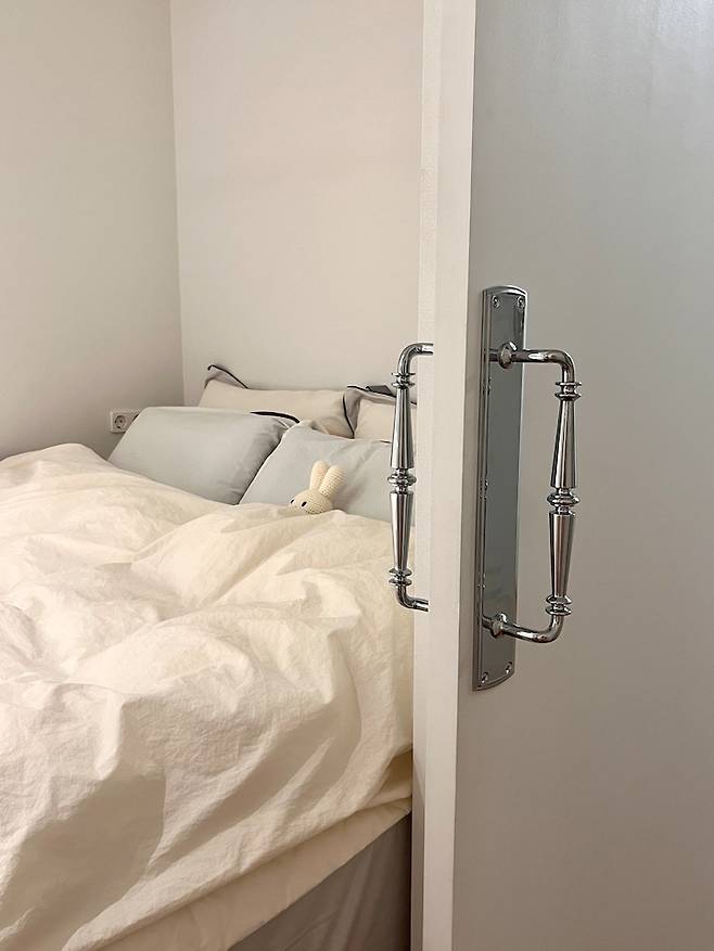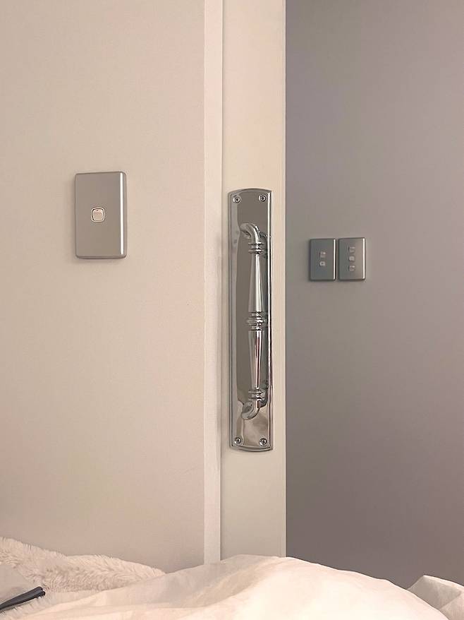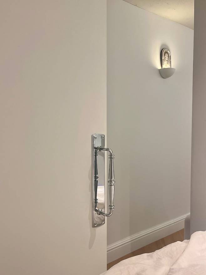 좁고 긴 복도의 포인트는 실버존이에요! 침실&화장실 손잡이, 스위치, 벽등에 올라간 오브제, 실버로 통일했답니다.