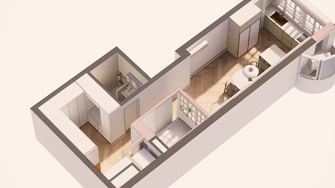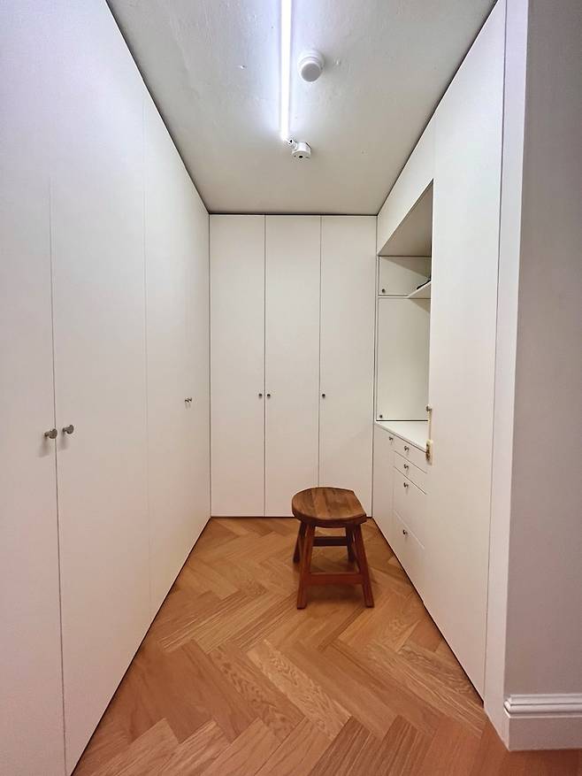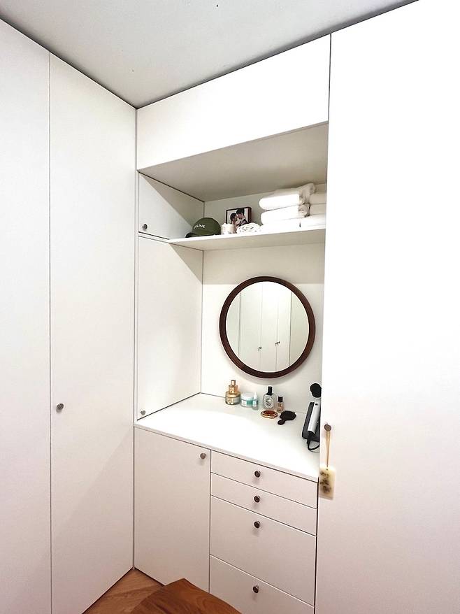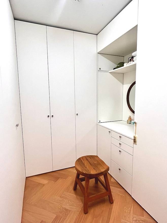 기존의 방은 붙박이장을 제작해서 드레스룸으로 사용하고, 답답함을 줄이기 위해 도어를 없앴어요! 18평 집에서 동선까지 생각하며 구조를 맞추는 게 쉽지 않더라구요, 이렇게 여러 아이디어 회의 끝에 저희 집 구조가 완성되었어요.