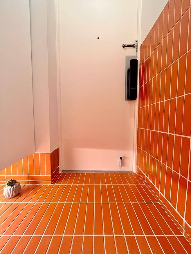 아담하지만 들어오자마자 오렌지 컬러의 타일이 눈에 띄어요. 차가운 컬러보다 밝고 따듯한 컬러로 했으면 하는 마음에 그린, 옐로우, 브라운 등 다양한 타일 찾아보고 상상해보다 오렌지 컬러로 결정을 했답니다.