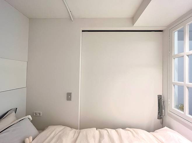 침실 안에서 슬라이딩 도어를 닫은 모습이에요.