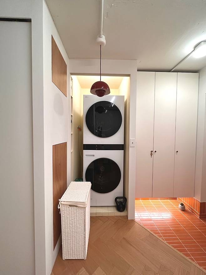 현관 타일 컬러와 세탁실 앞 앤트레디션 조명 컬러와도 잘 어울어지는 것 같아요.