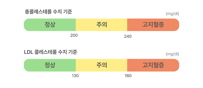 고밀도(HDL) 콜레스테롤과 저밀도(LDL) 콜레스테롤, 중성지방을 포함하는 총콜레스테롤의 수치는 200mg/dL 미만이면 양호, 200~239mg/dL면 주의, 240mg/dL 이상은 이상지질혈증으로 진단합니다. 결국 HDL, LDL 수치 모두 적절하게 관리하는 것이 중요한 것이죠.
