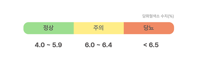 당화혈색소의 정상 범위는 5.6% 이하이고, 6.5% 이상일 경우 당뇨병으로 진단할 수 있습니다. 혈당의 경우 8시간 금식한 후에 측정했을 때 100mg/dL 이하가 나오면 정상입니다. 100~125mg/dL은 공복 혈당 장애, 126mg/dL 이상인 경우 당뇨병으로 진단합니다.