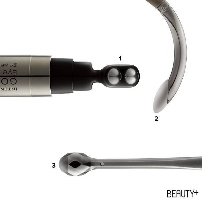 2구 스틸 볼 애플리케이터는 넓은 부위를 세심하게 케어하는 방법을 고안하다 개발한 것. 볼 두 개가 동시에 움직여 유효 성분을 더욱 균일하게 전달한다. 눈가뿐 아니라 팔자 주름, 마리오네트 등의 피부까지 케어할 수 있는 것도 장점이다.