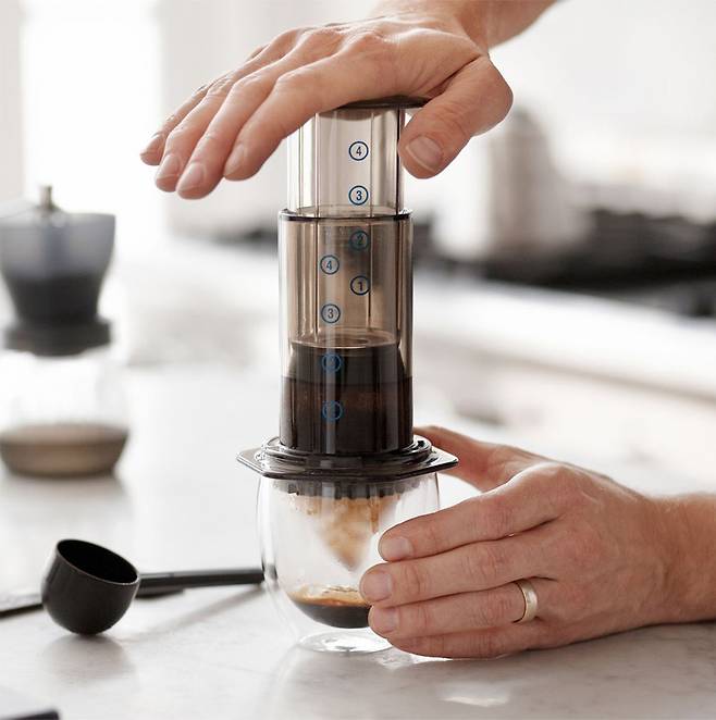 에어로프레스는 이 프렌치 프레스 방식을 더 재미있고 효율적으로 활용할 수 있는 제품으로, 주사기와 같은 피스톤 원리를 이용해 높은 압력으로 커피를 빠르게 추출해낸다. 프레스를 누를 때 약 20초 정도 일정하고 부드러운 압력을 주는 것이 관건이며, 너무 강한 힘을 가하면 컵이 깨지거나 미끄러질 수 있으니 평평한 바닥 위에서 천천히 눌러주는 것이 좋다. 가격은 약 3만 원대.