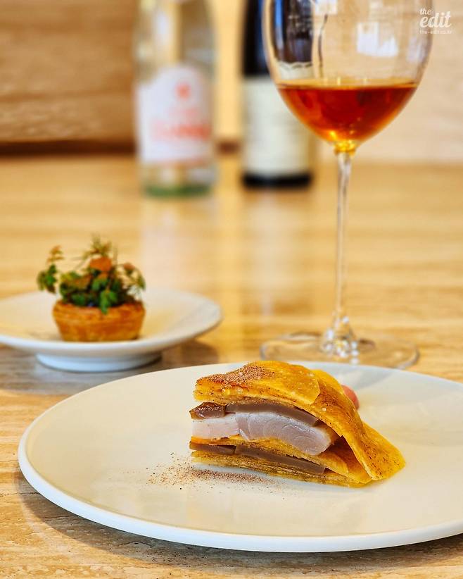 메뉴판에 삼치, 도토리, 장미라고 적혀 있어 궁금증을 자아냈던 메뉴. 얇게 저민 단감과 도토리묵, 삼치를 겹겹이 쌓아 올려 만든 차가운 생선 요리야! 여기에 장미와 비트가 들어간 마요네즈 소스를 함께 먹는데, 와, 정말 미쳤다! 그리고 여기서 페어링마저 너무나 감탄했어. 감과 도토리묵, 삼치, 장미… 도저히 내 머리로는 상상해 낼 수 없는 조합인데, 단감의 달콤 아삭함과 도토리묵의 쌉싸름한 풍미, 탱글한 질감, 그리고 생선 중에서도 유난히 부드러운 삼치로 만든 저 샐러드(?)는 아주 세련되고 완성도 높은 맛의 즐거움을 주더라고. 여기에 살짝 산화 캐릭터가 느껴지는 와인을 더하니 맛과 향이 얼마나 조화로운지.