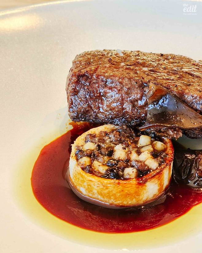 다음으로는 숯불에 익힌 한우 안심. 정말 심플한 플레이팅 아래로, 한우를 들추어 보니 토란과 목이버섯 피클이 아래 숨어있어. 땅의 향을 담은 돼지감자 소스와 대파 오일로 완성된 스테이크.