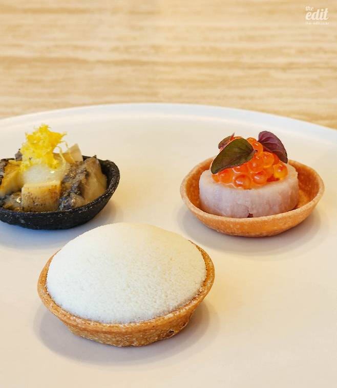 그리고 바로 이어, 세 가지의 타틀렛이 나와. 위가 하얀 타틀렛은 서양식 육회인 비프 타르타르에 곱게 간 파마산치즈를 눈처럼 소복이 올려 감칠맛이 정말 좋았지. 그 뒤로 보이는 검은 타틀렛은 살짝 산미가 느껴지도록 피클링한 전복에 레몬 크림, 레몬 제스트로 포인트를 줬어. 마지막으로는 아삭하면서도 부드럽게 익힌 연근에 로메스코에 버무린 송어알과 오레가노 허브를 올렸지. 각각의 조합이 새롭고 신선하면서도, 맛의 포인트가 확실해. 고소하고 감칠맛 가득한 비프 타르타르, 새콤하면서도 싱그러운 상큼함이 느껴지는 전복, 연근의 식감과 송어알의 조화로움까지.