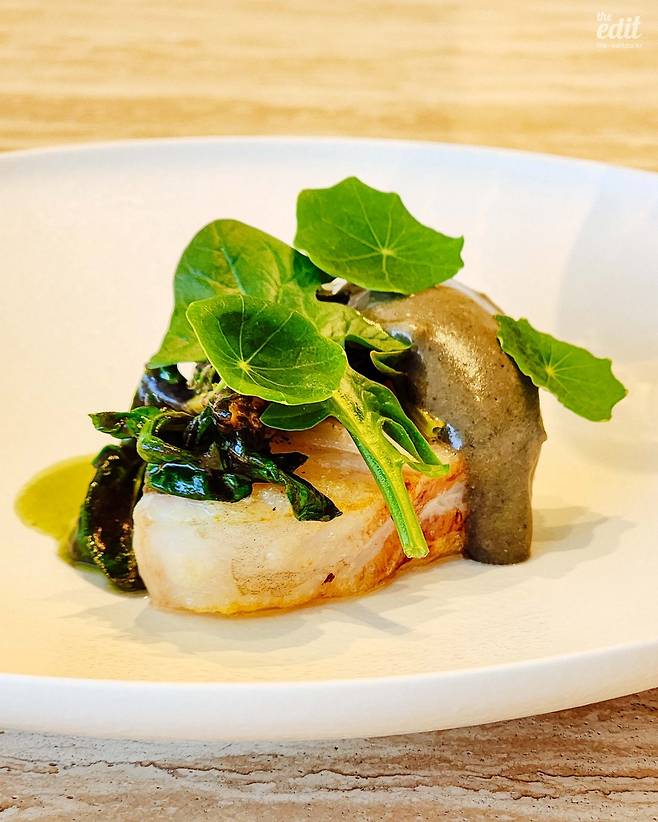 다음으로는 따뜻한 생선요리야. 이날은 겨울을 맞아 더 달큰한 제철 남해초와 대구가 나왔어. 양파 퓌레와 먹물 소스에 버무린 남해초를 숯불에 살짝 구워 탱글한 대구살 뒤에 올리고, 위로는 먹물 홀랜다이즈 소스를 곁들였지.