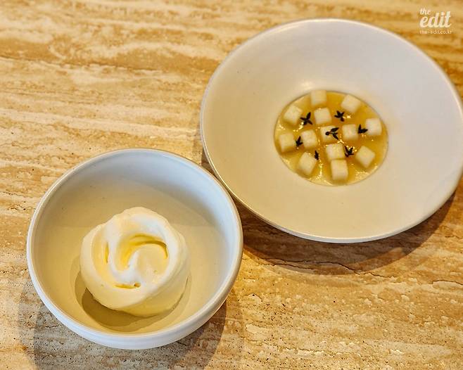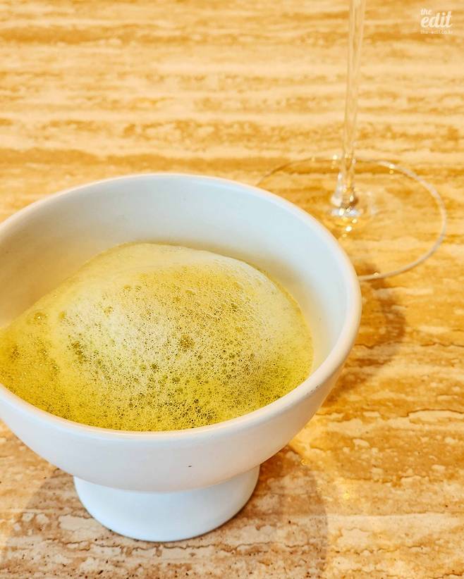 다음은 따뜻한 ‘감자’야. 작은 감자를 반으로 잘라 속을 파 그릇처럼 만들고, 그 속을 작은 메추리알 수란으로 채운 뒤에 대파와 감자로 만든 수프를 넣었어. 감자 껍질 오일까지 더해 고소하고 풍만한 땅의 맛이 가득한 요리야. 수프를 홀짝홀짝 마시다가 감자 그릇(?)을 통째로 먹을 수 있으니 재미있기도 해.
