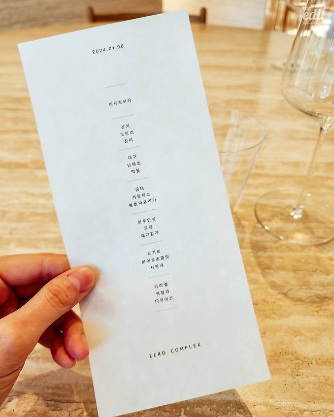 와인 페어링도 준비되어 있어. 제로컴플렉스는 내추럴 와인의 선구자라고 했잖아? 이곳에서 세심하게 음식과 연결한 다양한 내추럴 와인은 식사의 경험을 아주 많이 배가시키니, 꼭 고려해 봐. 개인적으로 나는 내추럴 와인을 자주 즐기지는 않는데, 이번에 몇 가지 페어링은 정말 놀랍도록 훌륭하더라고.