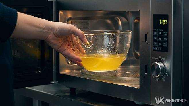 전자레인지를 보다 간편하게 닦기 위해서는 물과 식초가 필요하다. 큰 내열 용기에 물을 1컵 정도 담고 식초를 2~3큰술 넣는다. 이를 전자레인지에 넣고 5분 정도 돌린다.