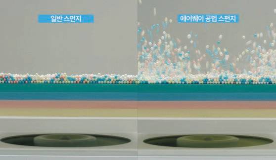 스티로폼 알갱이가 담긴 박스 안에 일반 스펀지와 에어웨이 공법 스펀지로 각각 적층 후 환풍기를 작동시키면, 에어웨이 공법 스펀지로 마감된 박스 안의 알갱이만 활발히 움직인다. 에어웨이 공법 매트리스가 원활한 공기순환으로 한결 위생적이고 쾌적하다는 점을 알 수 있다.