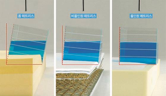 여러 종류의 매트리스 가장자리에 수조를 올려두고 물이 얼마큼 기울어지는지 측정한다. 그 결과, 에이스침대의 올인원 매트리스만이 수조의 균형을 유지했다. 가용면적이 커 가장자리까지 더 넓게 쓸 수 있는 에이스침대의 장점을 설득력 있게 소개하는 시험이다.