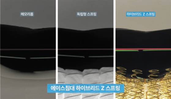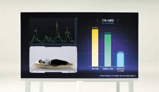 매트리스 종류에 따른 수면 중 근육 사용량을 측정하는 시험이다. 메모리 폼이나 독립형 스프링 매트리스는 수면 중 에너지 소비가 많아 잠에서 깨기 쉽다. 반면 탄성과 반발력이 뛰어난 하이브리드 Z 스프링은 불필요한 에너지 소비를 줄여 완벽한 숙면을 완성한다.