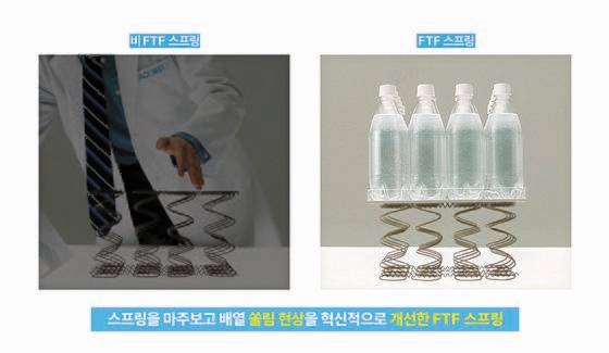 쏠림 현상을 최소화한 FTF 공법의 우수성을 증명하는 시험이다. 비(非)FTF 스프링 위에 생수 묶음을 올리면 금방 한쪽으로 쏠리지만, 스프링끼리 마주 보게 배열한 FTF 스프링은 무거운 무게도 쏠리지 않고 받쳐준다. 수면 시간 내내 몸을 안정적으로 지탱해주는 비결이다.