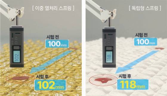 스프링판 위에 무게추를 올려 2주 후 스프링이 얼마큼 줄었는지 알아본다. 한 번만 열처리된 독립형 스프링은 18㎜ 내려앉았지만, 스프링부터 헤리컬코일까지 통째로 열처리해 탄력을 강화한 이중 열처리 스프링의 줄음률은 2㎜에 불과했다.