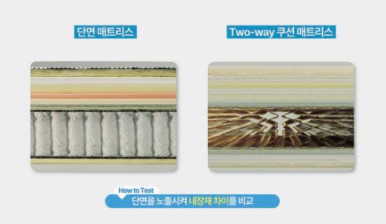 투웨이 쿠션 매트리스는 일반 매트리스와 달리 상·하면 양쪽에 내장재가 들어 있어 위아래로 뒤집어가며 양면 사용이 가능하다. 상면과 하면에 서로 다른 쿠션감을 선택할 수 있고, 하나의 매트리스로 일석이조 효과를 낸다.