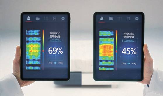 매트리스 위에 75㎏ 무게추를 올려 압력 분포도를 측정했다. 에이스침대의 투 매트리스는 상단 매트리스와 하단 파운데이션 전용 매트리스가 이중으로 받쳐주는 구조로 효과적으로 압력을 분산한다. 편안한 사용감은 물론 매트리스 내구성과 수명도 원 매트리스에 비해 뛰어나다.