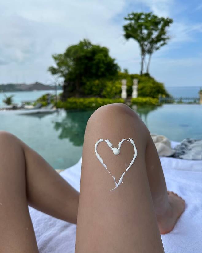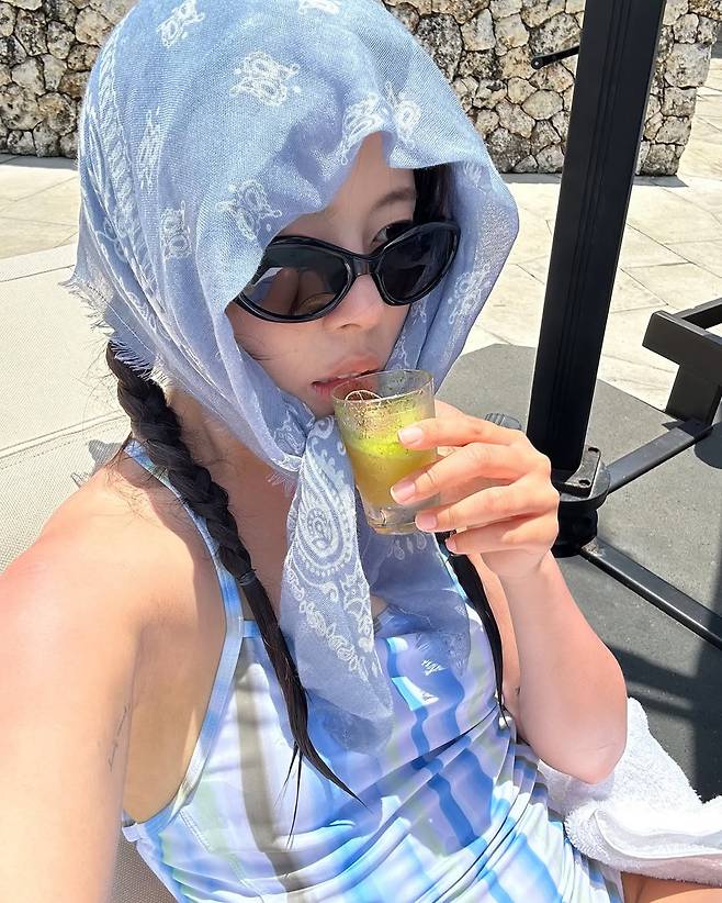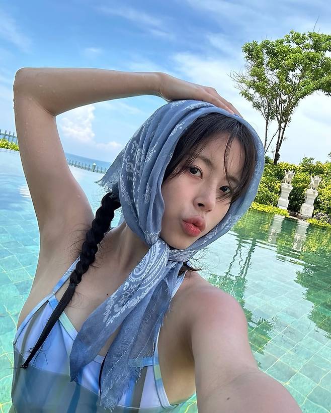 푸른 하늘과 해변을 닮은 컬러가 시원한 느낌을 더하며, 바캉스 무드를 한층 살려준다. 수영복의 부드러운 실루엣이 그녀의 내추럴한 분위기와 어우러지며, 발리의 감각적인 풍경 속에서 자연스러운 조화를 이룬다.