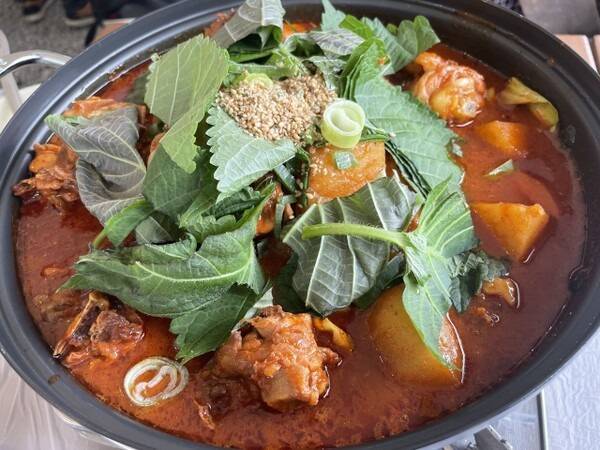 감자탕의 핵심은 돼지 등뼈를 오랜 시간 끓여 우려낸 뼈 육수입니다.