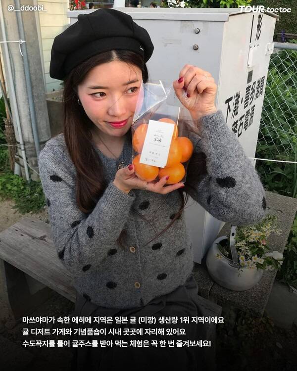 마쓰야마가 속한 에히메 현은 소위 '미깡'이라 불리는 일본식 귤 생산량 1위 지역입니다. 귤 디저트를 판매하는 상점과 기념품 숍이 시내 곳곳에 자리해 있으니, 꼭 한 번 방문해 보세요.