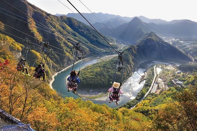 병방치 스카이워크와 집와이어가 자리한 **‘정선 아리힐스(Arichills)’**는자연 속에서 하늘을 즐길 수 있는 복합 체험 공간입니다. 이곳에서는 스카이워크 외에도 산악바이크, 집라인, 짚코스터 등 다양한 체험이 가능하며, 전망대 주변에는 카페, 포토존, 휴식 데크도 마련되어 있습니다. 가을에는 단풍으로 물든 산자락과 동강의 푸른 물결이 어우러지고, 겨울에는 새하얀 눈이 유리전망대 아래를 덮어 마치 하늘 위에서 겨울왕국을 내려다보는 듯한 풍경이 펼쳐집니다. 날씨에 따라 운무가 병방치 능선을 감싸기도 하는데, 그 순간 이곳은 말 그대로 ‘하늘 위의 길’이 됩니다.