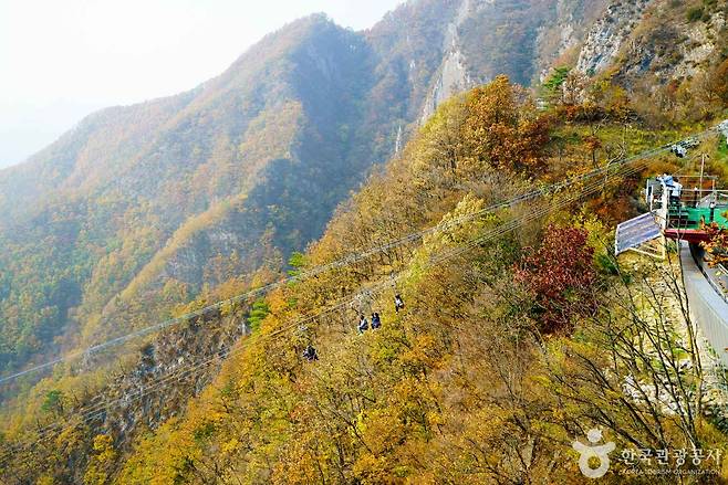 스카이워크는 절벽 끝에 설치된 **U자형 유리전망대(길이 11m)**로, 발아래로는 투명한 유리판 너머 깊은 계곡이 한눈에 들어옵니다. 처음 한 발을 내딛을 때의 두려움은 잠시, 곧 푸른 하늘과 바람, 그리고 동강의 물결 이 몸 전체를 감싸는 듯한 짜릿한 해방감으로 바뀝니다. 유리 아래로 비치는 강물과 바위의 질감, 그리고 멀리 굽이치는 능선의 실루엣은 가을 산하의 장엄함을 그대로 전해줍니다.