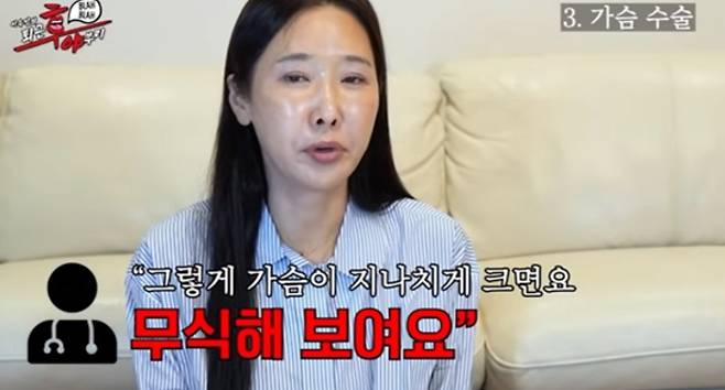 이어 그는 "이중 평면인지 근막인지, 어디로 째는 게 좋고 요즘은 뭐가 트렌드인지 모르겠고 '아무 데나 째고 무조건 크게 해주세요'라고 했다. 진짜 단순하다"고 설명했는데요. "가슴 수술하면 몇 컵으로 커지냐"는 질문에는 "하기 나름이다. 한두컵 올릴 수도 있고 심하면 3컵까지 올린다. 근데 정말 중요한 건 가슴의 무게를 견디지 못한다는 것"이라고 대답했습니다.