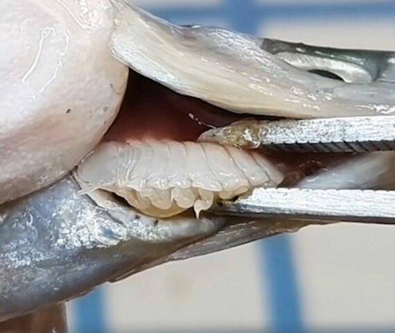 이 아감벌레는 학꽁치의 몸에서 끊임없이 혈액을 빨아먹는것도 모자라서 숨조차 편안히 쉬지 못하도록 만들죠.