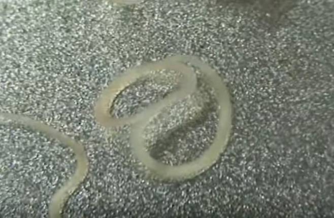 아가미를 들추면 모습을 드러내는 정체불명의 하얀색 벌레! 이 기생충의 이름은 '아감벌레'인데요.