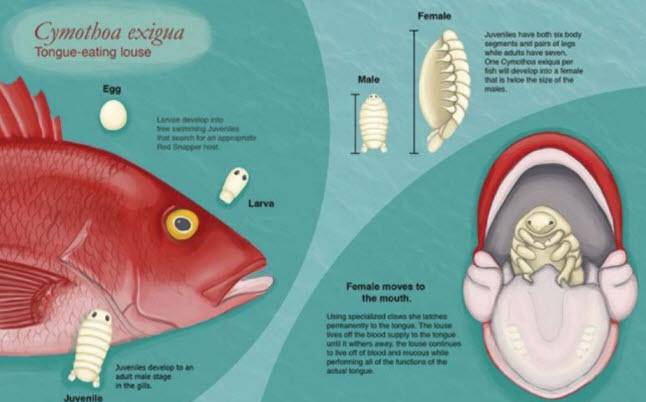 도미의 아가미로 침입한 엑시구아 유충은 뾰족한 갈고리 같은 발로 도미의 혀에 찰싹 달라 붙죠.