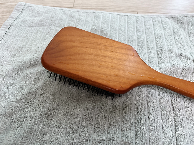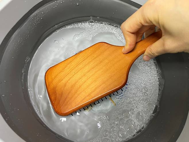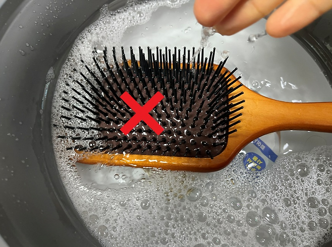 나무로 된 헤어빗은 뒤집어서 솔 부분을 씻어줍니다. 손잡이를 잡고 샴푸물에 휘적여 잔여물을 제거해 줍니다. 샴푸 성분이 없어지도록 이후에 2~3회 깨끗한 물에 헹굽니다.