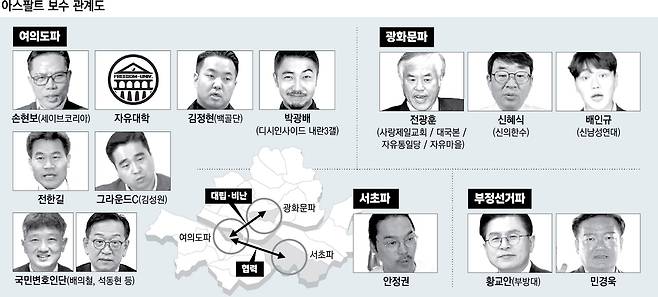아스팔트 보수는 12·3 불법계엄과 헌재 탄핵심판 등을 거치며 사안·노선 등을 두고 여러 갈래로 분화했다. 대표적으로 전 목사가 이끈 ‘광화문파’와 손현보 세이브코리아 대표(세계로교회 목사)가 이끈 ‘여의도파(손현보·세이브코리아파)’로 나뉜다. 광화문역 인근에 모이던 광화문파와 달리 여의도파는 주로 국회 앞과 부산·대구 등에서 집회를 이어왔다.