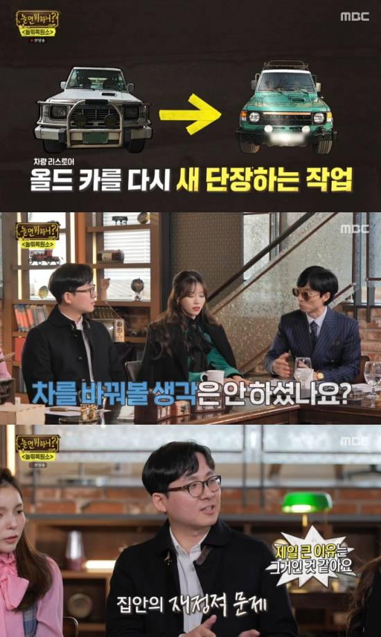이이경은 "요즘 리스토어해서 많이 타고 다닌다"라며 밝혔고, 한기진 씨는 "제가 고쳐보려고 리스토어를 알아봤다. 대부분 레저용으로 캠핑용으로 많이 하더라. 저희 아버지는 실제 데일리로 운행을 하셔야 해서 그런 부분이 맞지 않았다"라며 설명했다.
