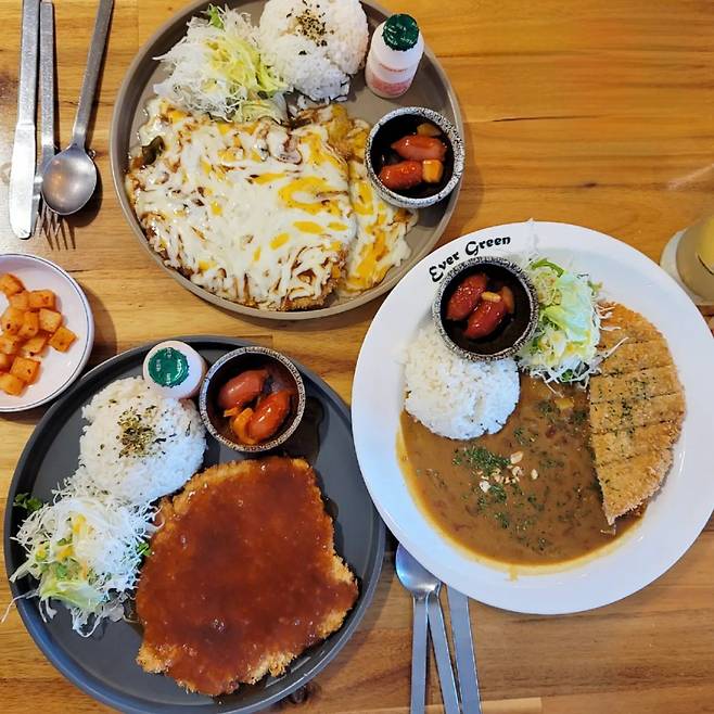 제주 애월에 위치한 '에버그린 돈까스'는 100% 제주산 흑돼지로 만든 돈까스를 맛볼 수 있다. 옛날 돈까스는 다소 투박한 모습이지만 커다란 돈까스와 샐러드, 밥, 요구르트, 후식 과일까지 알차게 들어 있다. 2,000원을 추가하면 식전 스프와 빵이 제공되며 매장에서 직접 구워낸 수제빵과 전통 방식으로 끓여낸 수제스프를 맛볼 수 있다.