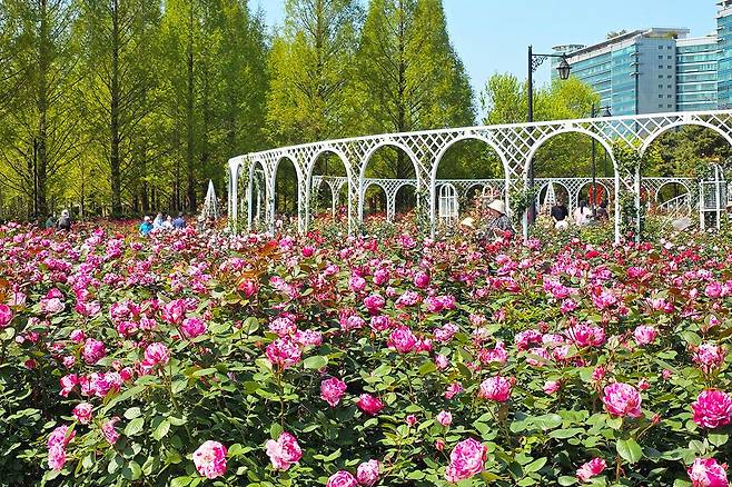 장미의 계절을 정점으로 향하게 하는 이 공간에는 란도라, 루이스 드 퓌네, 슈와르쯔 마돈나 등 무려 40여 종, 약 2만 4천 송이의 장미가 펼쳐진다.