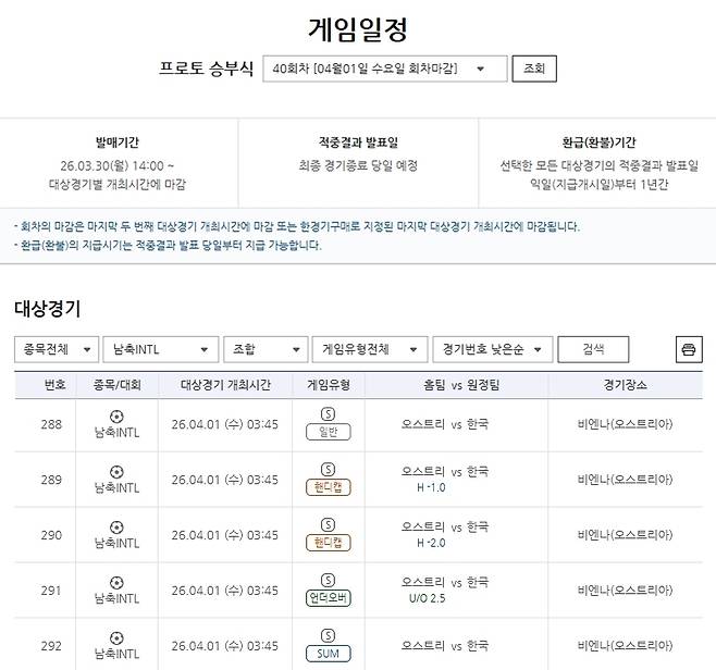 서울올림픽기념국민체육진흥공단(이사장 하형주)이 발행하는 체육진흥투표권 스포츠토토의 수탁사업자인 한국스포츠레저㈜가 1일 3시 45분에 비엔나(오스트리아)에서 열리는 대한민국(원정)-오스트리아(홈)전을 대상으로 한 프로토 승부식 40회차 게임이 발매 중이라고 밝혔다.