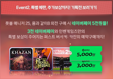 세가 PC 신작 2종에는 특별 예판 할인 가격이 적용된다. 오는 2월 21일에 발매되는 '용과 같이8 외전'과 3월 발매 예정인 '풋볼 매니저 25'의 예약 구매자에게는 네이버페이 5,000원과 10,000이니, 1,000베니 보상이 함께 지급된다.