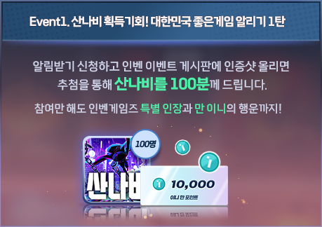 인벤게임즈 정식 런칭을 기념하여 1월 15일부터 오는 2월 25일까지 네오위즈의 '산나비', '디제이맥스 리스펙트V', 민트로켓의 '데이브 더 다이버'를 추첨을 통해 무료로 제공하는 ‘대한민국 좋은게임 알리기' 이벤트가 진행된다. 인벤게임즈 스토어에서 '알림 설정' 후 알림 인증 이미지를 캡처하여 게시하면 이벤트에 참가할 수 있으며, 첫 번째 이벤트로 추첨을 통해 네오위즈의 명작 인디게임 '산나비' 100개가 지급될 예정이다. 동시에 이벤트 참가자 전원에게는 게임 코드 구매시 사용할 수 있는 1,000원 할인 쿠폰과 인벤게임즈 특별 인장, 10,000이니가 제공된다.