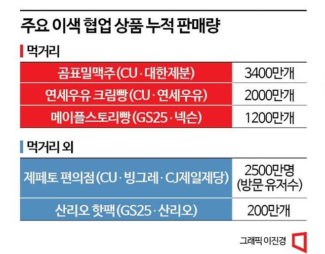 이색 협업의 시초가 된 상품은 ‘곰표밀맥주’다. 곰표밀맥주는 CU가 2020년 대한제분·세븐브로이와 손잡고 선보인 상품이다. 밀가루 브랜드 곰표를 내세운 만큼 부드러운 거품과 고소한 향을 살리는 데 주력했다. 당시 높은 인기에 곰표밀맥주는 수요에 비해 생산 시설의 한계로 공급이 원활하지 않아 소비자들 사이에서 품절템으로 불렸다. 누적 판매량은 약 3400만개로 출시한 지 2년이 지났지만, 현재도 카스에 이어 맥주 판매 순위 2위를 차지하고 있다.