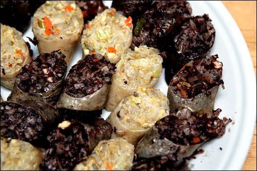 한국에서는 흔히 찹쌀과 당면을 넣어 만들지만, 유럽에서는 돼지고기와 허브, 다양한 향신료를 넣어