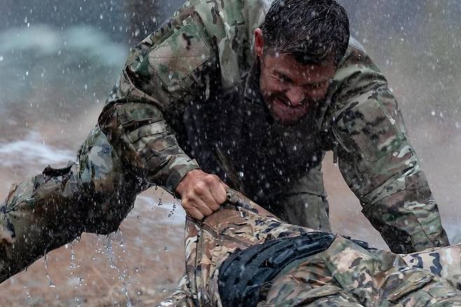 공개된 사진 속 크리스 헴스워스는 군복을 입고 있는가하면, 김동현과 체육관에서 글로브를 끼고 격투를 벌이고 있어 눈길을 끈다.