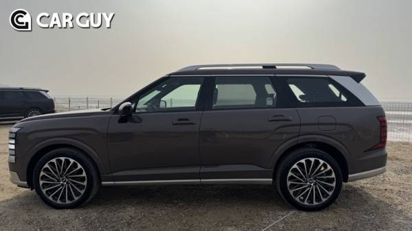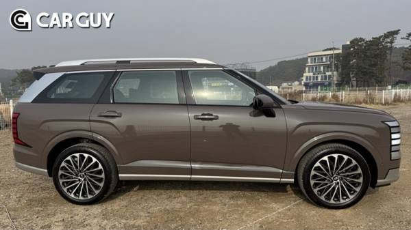 측면은 신형 팰리세이드 디자인의 핵심이다. 기존 모델보다 70mm 길어진 전장 5060mm의 프로포션이 인상적이다. 짧은 전륜 오버행부터 범퍼 하단에서 사이드 스커트를 지나 후면 범퍼까지 이어지는 실버 도금이 중후하면서도 안정적으로 보인다.