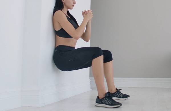벽에 등을 기대고 서서 무릎을 천천히 구부리며 엉덩이를 내립니다. 허벅지가 바닥과 평행이 되도록 자세를 만든 뒤, 손은 가슴 앞에서 잡고 시선은 정면을 응시합니다.