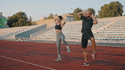 바닥에 서서 다리를 어깨너비보다 넓게 벌리고 손을 머리 옆에 둡니다. 왼쪽 무릎을 들어 올리면서 상체를 왼쪽으로 비틀어줍니다. 이어서 오른쪽 무릎을 당기며 상체를 오른쪽으로 틀어줍니다.
