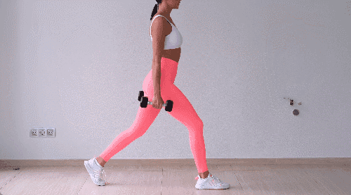 바닥에 서서 양손에 아령을 들고 준비합니다. 오른쪽 다리를 앞으로 내디디며 상체를 곧게 세우고 시선은 정면을 유지합니다. 무릎을 90도로 구부려 런지 동작을 하면서 동시에 팔꿈치를 구부려 아령을 들어 올렸다가 다시 내립니다.