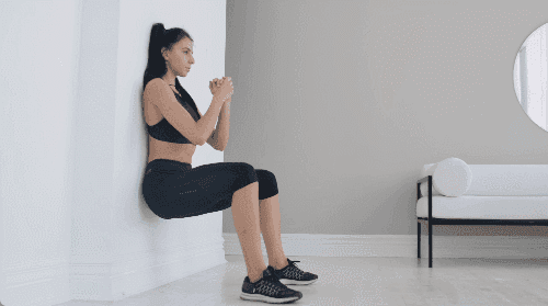 벽에 등을 기대고 서서 무릎을 천천히 구부리며 엉덩이를 내립니다. 허벅지가 바닥과 평행이 되도록 자세를 만든 뒤, 손은 가슴 앞에서 잡고 시선은 정면을 응시합니다.
