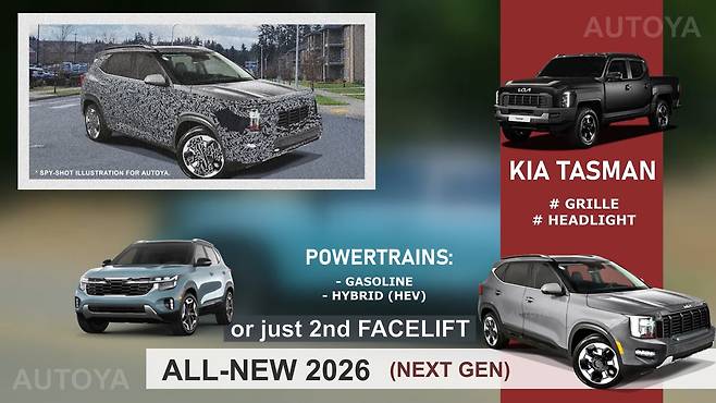 AutoYa는 스파이샷을 분석하며, “차세대 셀토스(혹은 대대적인 페이스리프트 모델)가 중형 픽업트럭 기아 타스만에서 영감을 받아 사각형 수직형 헤드램프와 강인한 전면 그릴을 채택할 것”이라고 예고했다.