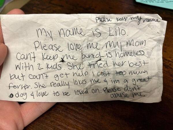 쪽지에는 “제 이름을 지켜주세요. 제 이름은 릴로예요. 절 사랑해 주세요"라며 "엄마는 노숙자 신세로 아이 두 명을 키우고 있어요. 엄마는 최선을 다했지만 도움을 받을 수 없었어요. 엄마는 절 정말 사랑해요. 저는 훌륭한 강아지예요. 저는 사랑받는 걸 좋아해요. 제발 절 학대하지 말아 주세요”라고 적혀있었습니다.